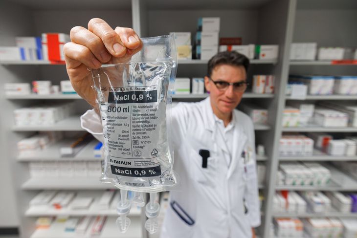 Isotone Kochsalzlösung ist eine der bedeutendsten Flüssigkeiten im Spital. Das bestätigt Dr. phil. Markus Lampert, Leitender Spitalapotheker im Kantonsspital Olten. Sie dient zum Spülen von Wunden oder den Augen, zum Reinigen von Kathetern und als Trägerlösung für Medikamente, die per Infusion verabreicht werden.