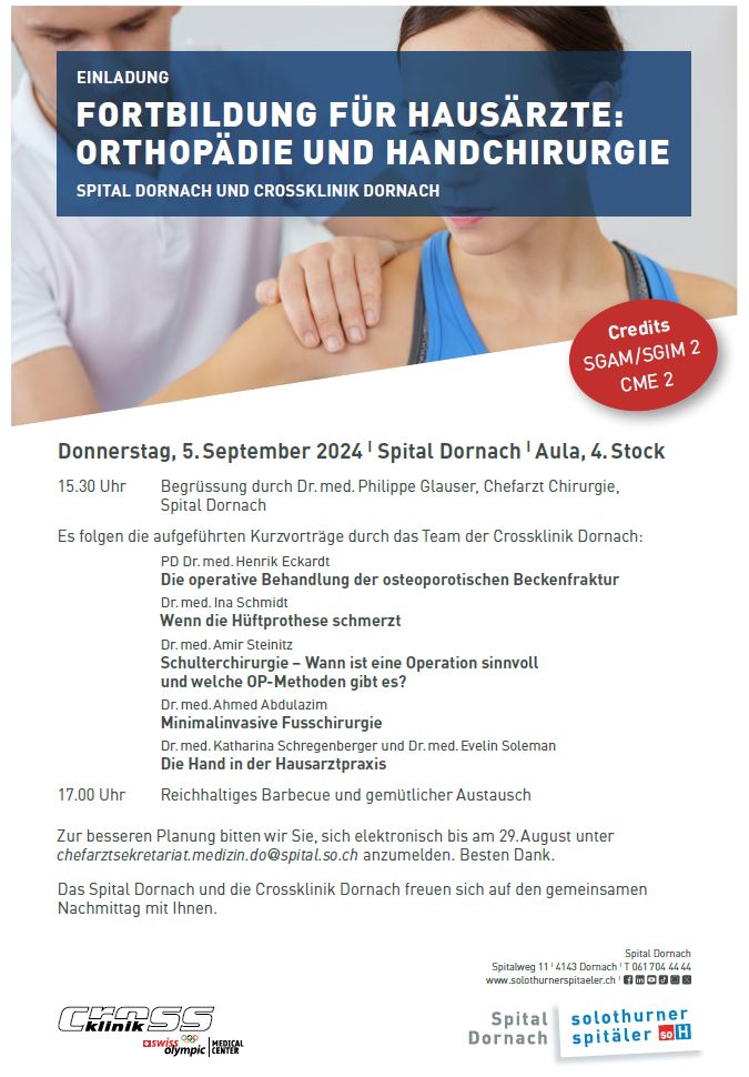 Das Spital Dornach und die Crossklinik Dornach freuen sich auf den gemeinsamen Nachmittag mit Ihnen mit abschliessendem Barbecue. Für die Teilnahme erhalten Sie 2 Credits SGAM/SGIM respektive CME.
