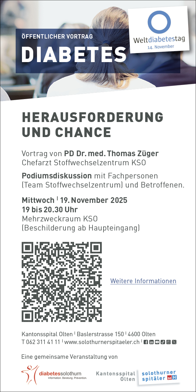 Veranstaltet wird der Abend vom Kantonsspital Olten und diabetessolothurn. Wir freuen uns auf Ihre Teilnahme und eine rege Diskussion im Anschluss an den Vortrag.